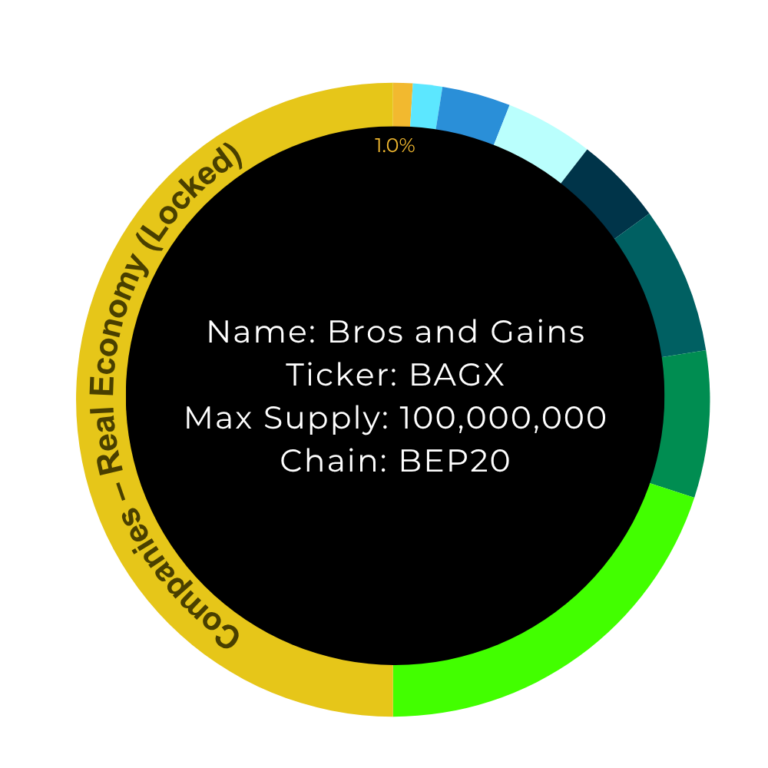 50.0% Realwirtschaft/ Unternehmensstruktur: 50 % aller BAGX-Token sind vom Handel ausgeschlossen und werden von unseren Investmentgesellschaften gehalten. Sie dienen als Sicherheit für unsere Unternehmensstrukturen sowie für Investoren, die außerhalb des Kryptosektors in Bros & Gains investieren. Dieses Vorgehen ermöglicht es der Community, beide Geschäftsbereiche künftig unabhängig voneinander zu entwickeln und das Projekt als Ganzes nachhaltig zu skalieren.