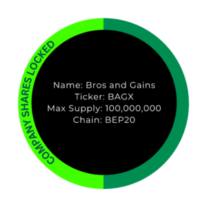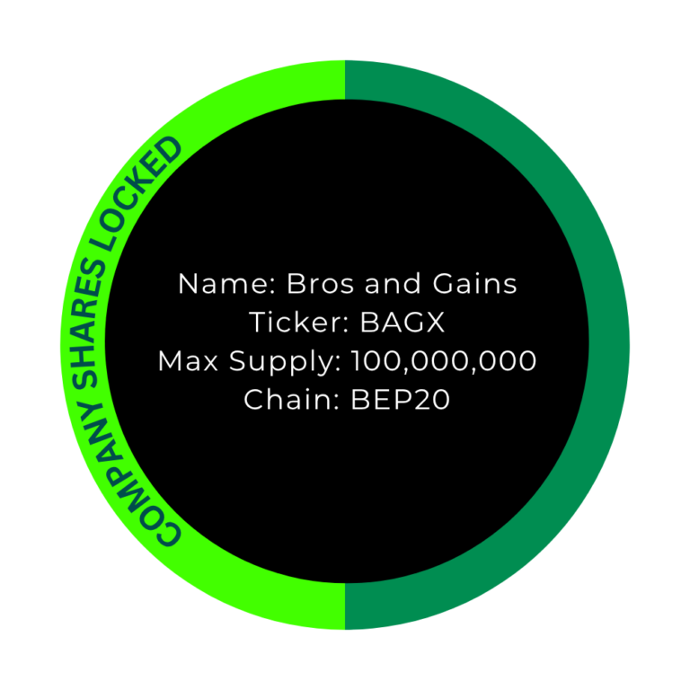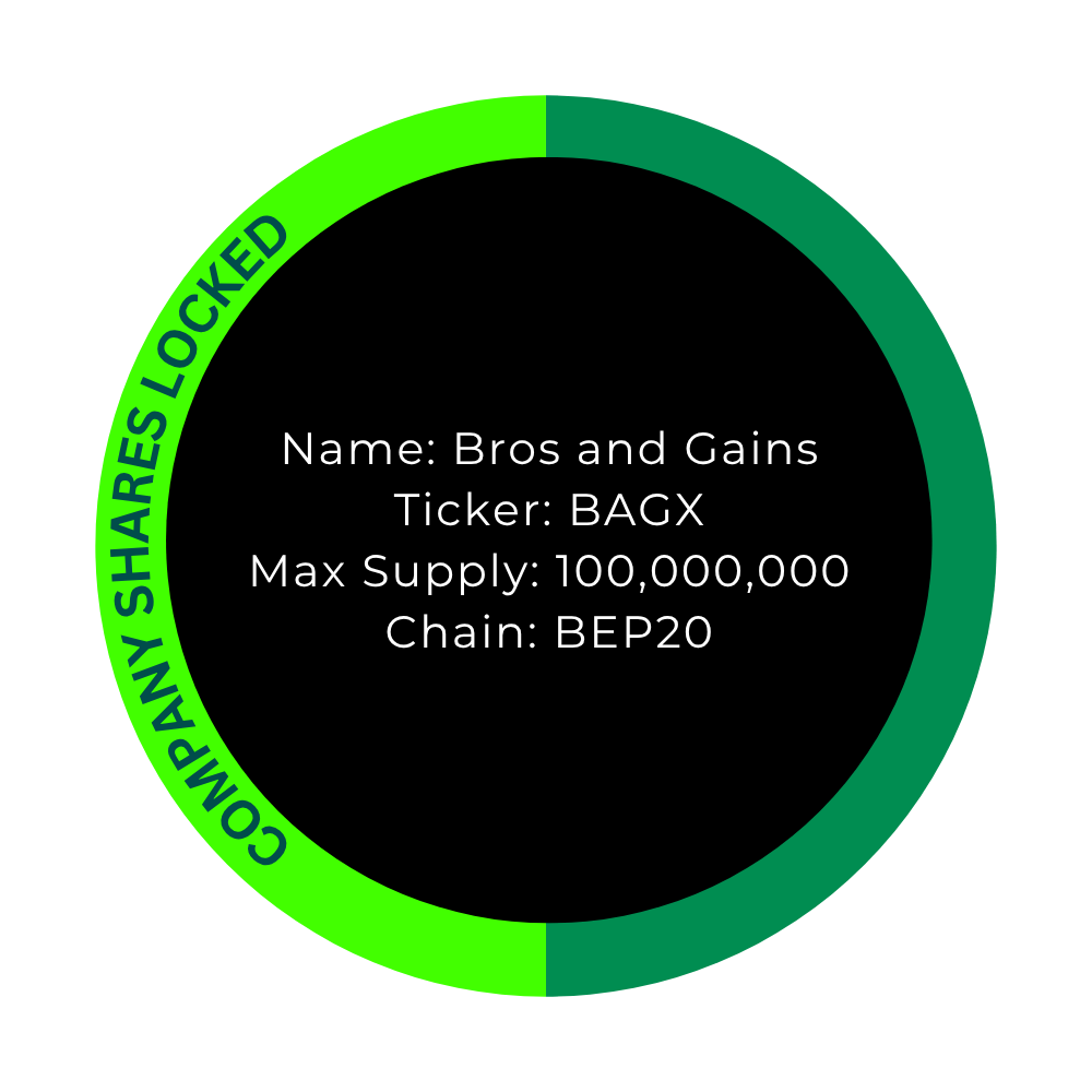Our investment companies hold 50 % of all BAGX tokens, and therefore 50 % of Bros & Gains as a whole. These BAGX tokens are locked and not intended for trading; they are used solely as security for our corporate structure. Participation in our companies is available exclusively on a private, contractually regulated basis and is reserved for selected investors. No public offering will take place.